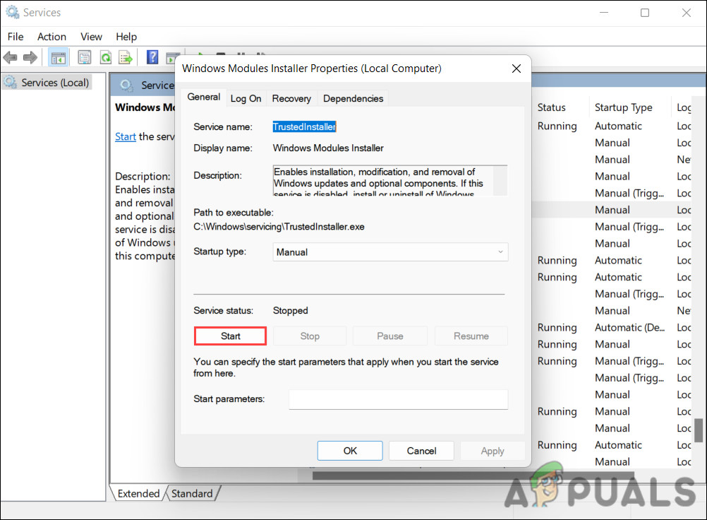 Access the properties of the Windows module installer - In the Properties dialog, click on the Start button if the service is disabled.