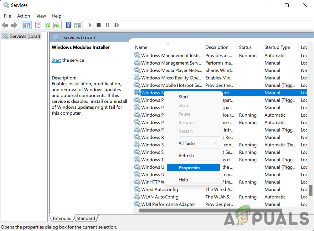 - In the following dialog, look for the Windows Module Installer service and right-click on it.