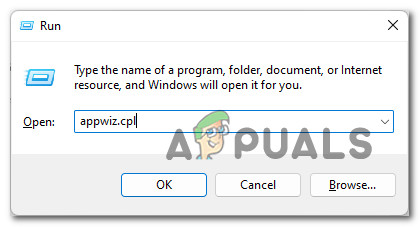 - Press Windows key + R to open up a Run dialog box. Next, type ‘appwiz.cpl’ inside the text box and press Ctrl + Shift + Enter to open up the Programs and Features menu with admin access.