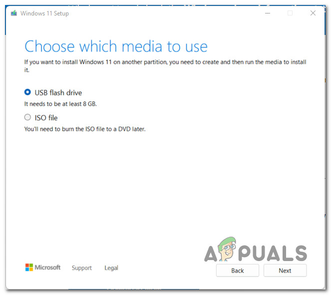Creating the Windows Installation media - At the next screen, select USB flash drive or ISO file – depending on if you want to create a flash drive or DVD installation media of Windows 11.