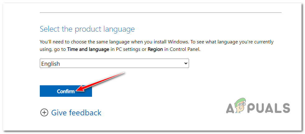 - From the next prompt that just appeared, use the drop-down menu to select your preferred language before finally clicking on Confirm.