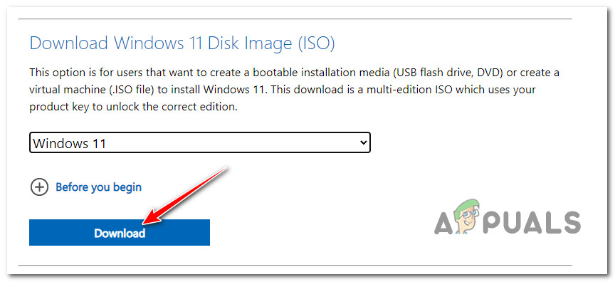 - Once you’re inside the correct page, scroll down to the Download Windows 11 Disk Image (ISO) section, then select Windows 11 using the Select Download button.