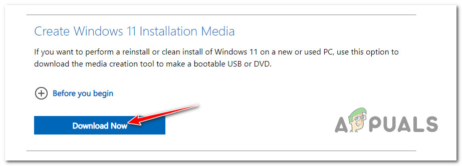 - Once you’re inside the Windows 11 Download page, scroll down to the Create Windows 11 Installation Media section, then click on the Download Now button.