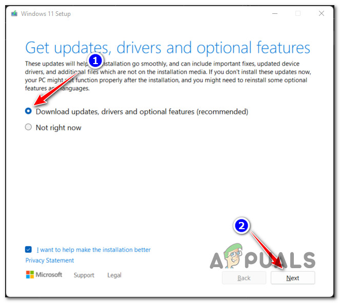 Accessing the Setup screen - Once you’re inside the Setup screen of Windows 11, select the Download upgrades, drivers, and optional features (recommended), then follow the remaining instructions to complete the upgrade to Windows 11.