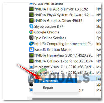 - After you manage to find the entry associated with the conflicting software, right-click on it and choose Uninstall from the context menu.