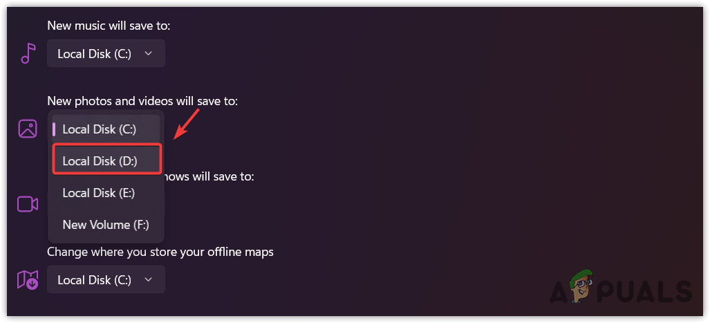 - Here change the Local Disk to any other disk of New photos and videos will save to.