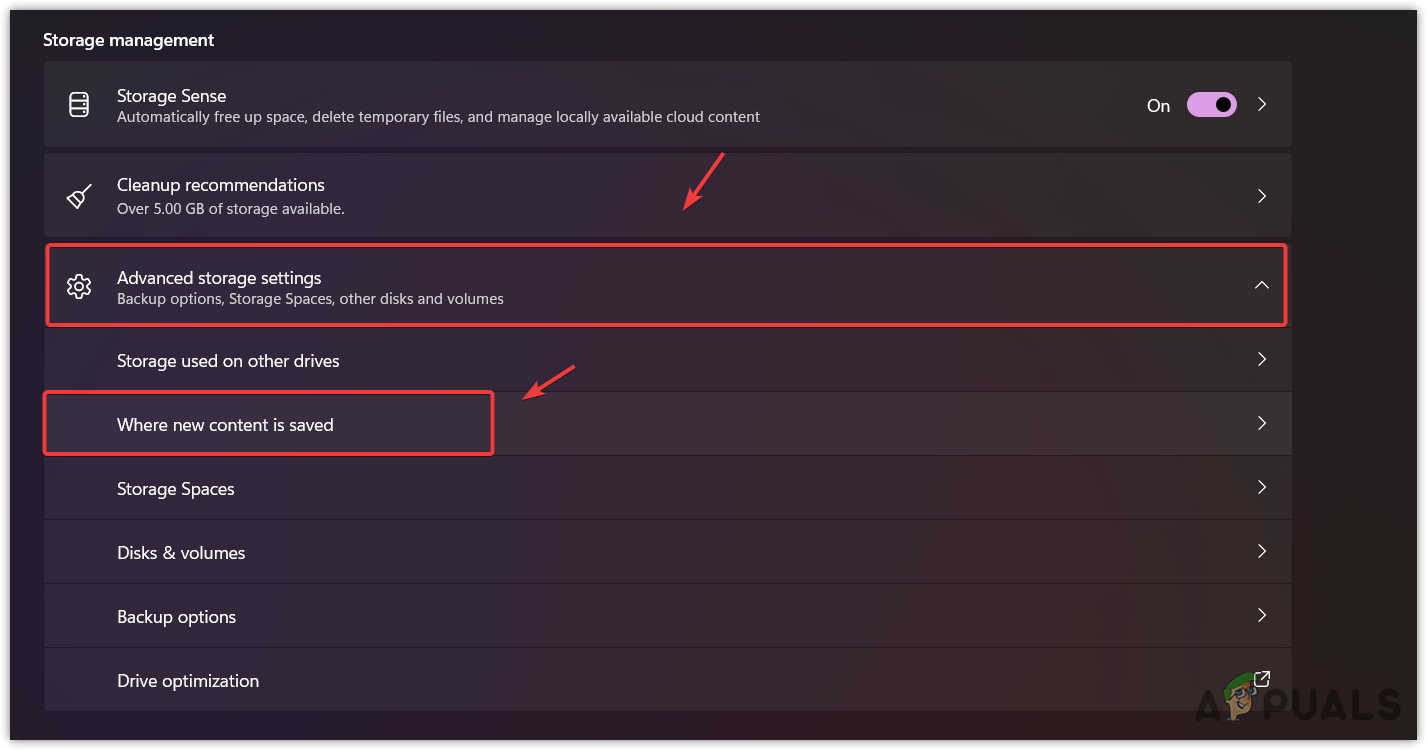 - Now click Where new content is saved from the list of options.