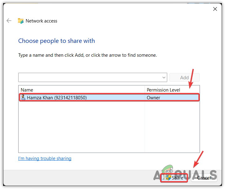 - Select your own account and click Share.