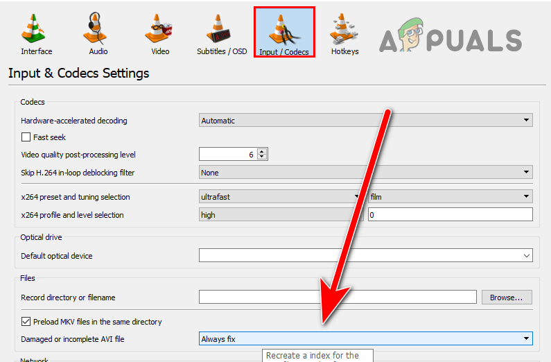 Click on Preference to navigate into the settings - Click on the Input / Codecs on the top, and you should see the Damaged or Incomplete AV1 file option on the bottom.