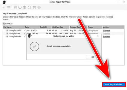 Click on Repair to start the repair process of the corrupted video - Once you receive the Repair process is completed message then click on Save Repaired File to save the recovered file.