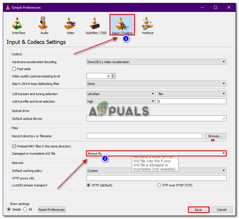 Open Preferences - Now, click on Input / Codecs, and under Damaged or incomplete File change it to Always Fix then click on save
