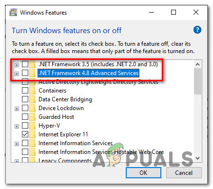 In Programs and Features, click on Turn Windows Features On or Off - From the insides of the Windows Features screen, uncheck the boxes associated with .ET Framework 3.5 (includes .NET 2.0 and 3.0) and .NET Framework 4.8 Advanced Services and click Ok to save the changes.