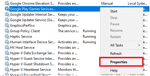 - Right-click each service and select Properties.