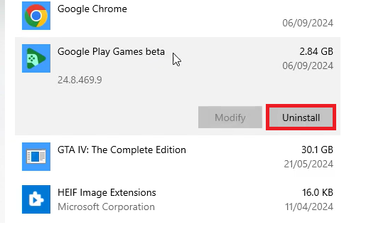 - Find Google Play Games, right-click it, and select Uninstall.