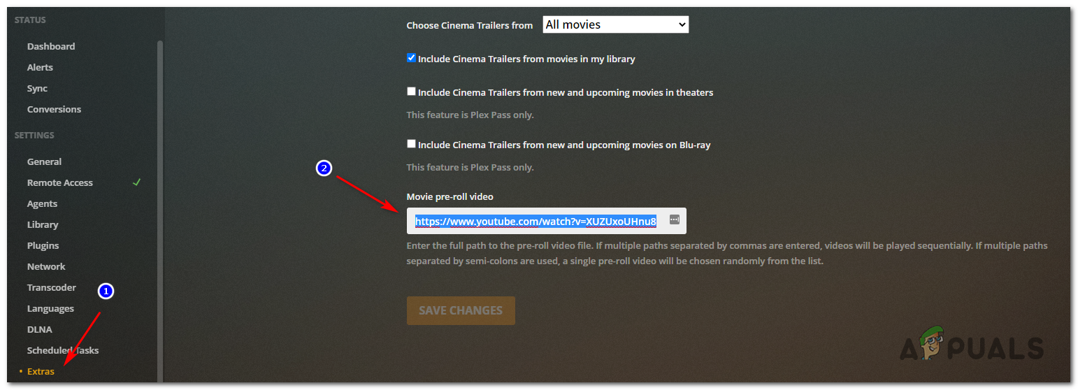 - Custom URLs inside the Extras menu – As it turns out, this problem is known to occur in instances where users have previously populated the Movie pre-roll video box inside the Extras menu of your Plex server menu. In this case, clearing the links from the Movie Pre-roll video box should fix the problem for good.