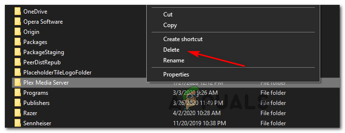 %LOCALAPPDATA% - Inside the App Data > Local folder, scroll down through the list of folders and locate the folder named Plex Media Server. When you see it, right-click on it and choose Delete from the newly appeared context menu.