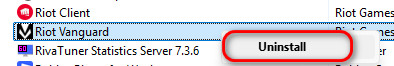 - Find Riot Vanguard, right-click, and select Uninstall.