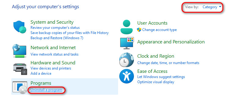 - Click Uninstall a program under Programs (set “View by” to Category if needed).