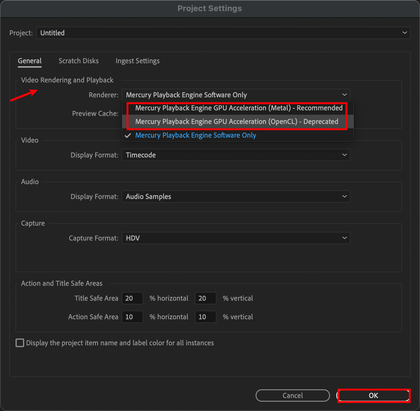 - Under Renderer, switch from Mercury Playback Engine GPU Acceleration to Mercury Playback Engine Software Only.