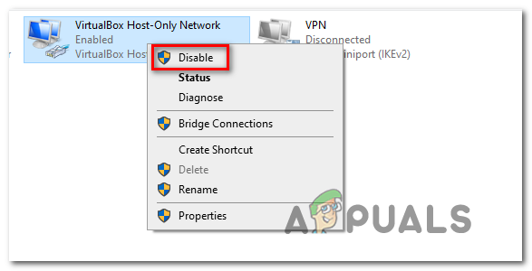 - Conflicting network adapters – As it turns out, it’s possible that you’re seeing this problem due to a conflict between two network adapters that you currently have installed on your computer. To fix this problem, you should disable every non-essential network adapter.