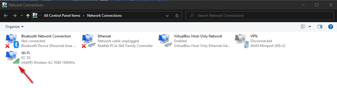 Run this in the Run dialog box - Once you’re inside the Network Connections tab, you’ll see a list of network adapters that are currently installed on your computer. First, determine which adapter is active at this moment – By seeing which one has the signal icon.