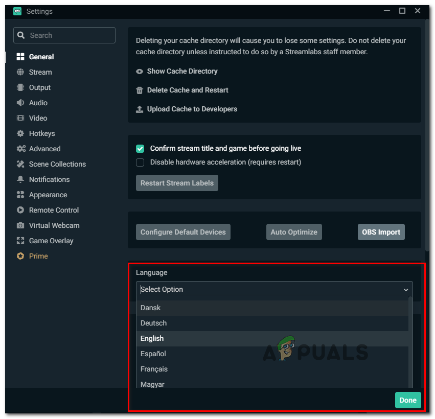 Changing the default language in StreamLabs - Hit Done to save the changes, then close the StreamLabs app before starting it again.