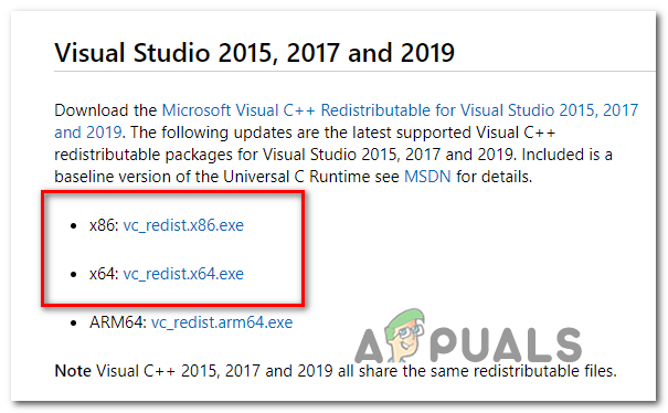 - Once you’re on the correct page, scroll down to the Visual Studio 2015, 2017, and 2019 section and click on vc_redist.x86.exe if your Windows version is on 32-bit or vc_redist.x64.exe if your Windows version is on 64 bit.
