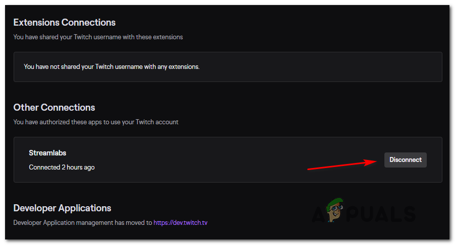 Accessing the Settings menu of Twitch - Once you’re inside the Settings menu, click access the Connections menu, then scroll down to the Other Connections section and click the Disconnect button related to StreamLabs.