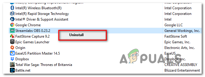 Type appwiz.cpl and Press Enter to Open Installed Programs List - Once you’re inside the Programs and Features menu, scroll down through the list of installed applications and locate StreamLabs OBS. When you see it, right-click on it and choose Uninstall from the context menu.