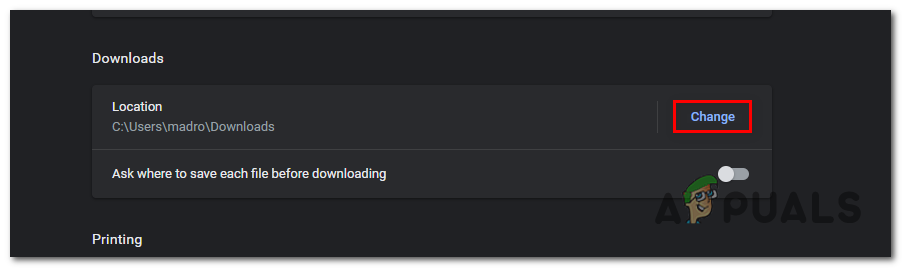 Open Chrome Settings - Inside the Settings menu, scroll down to the Downloads section and click the Change button associated with Location.