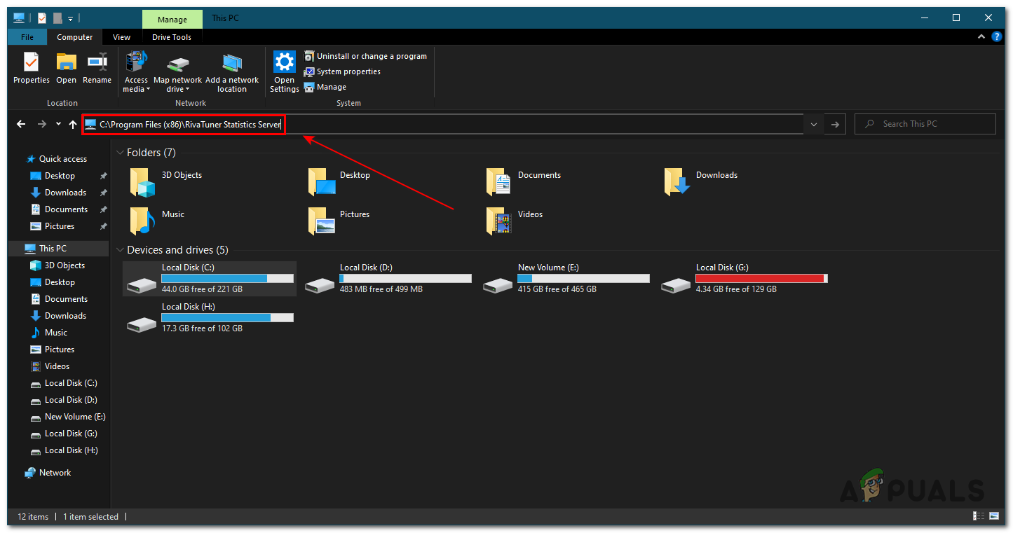 - On the resgestry paste this location “C:\Program Files (x86)\RivaTuner Statistics Server” (if have MSI Afterburner installed). Press enter