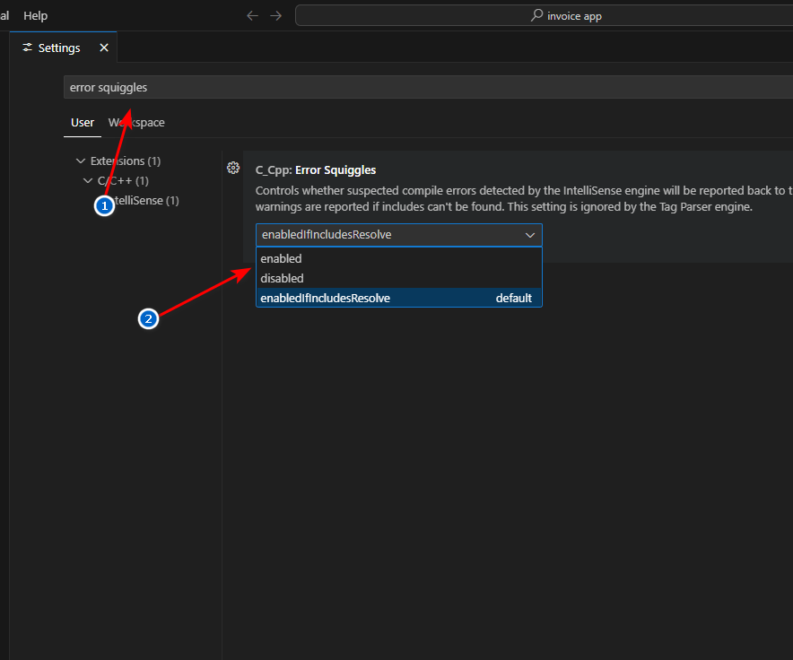 - Set the C_Cpp: Error Squiggles option to enabled or enabledIfIncludesResolve.