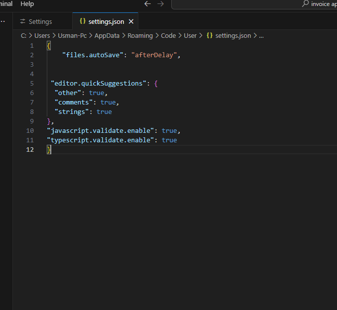 { "files.autoSave": "afterDelay", "editor.quickSuggestions": { "other": true, "comments": true, "strings": true }, "javascript.validate.enable": true, "typescript.validate.enable": true }