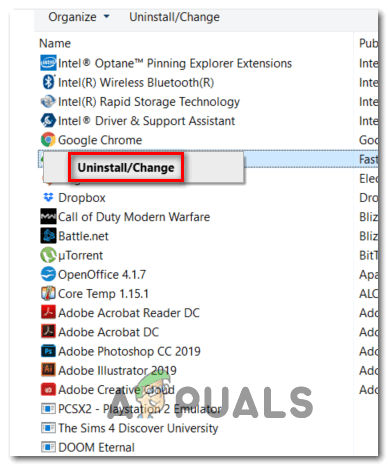 - Press Windows key + R to open up a Run dialog box. Next, type ‘appwiz.cpl’ and press Enter to open up the Programs and Features menu.