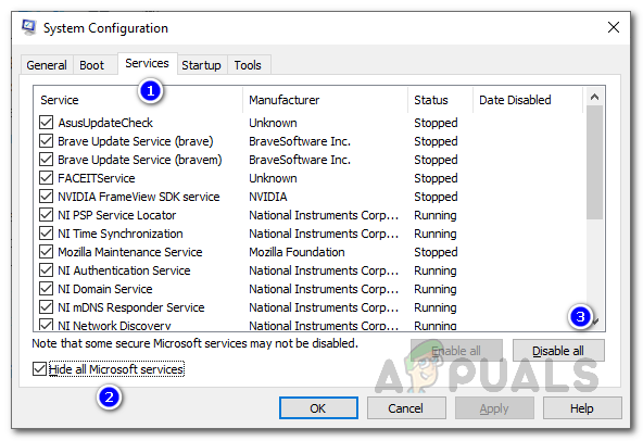 Hiding all Microsoft Services - After that, click on the Disable all button provided. Click the Apply button.