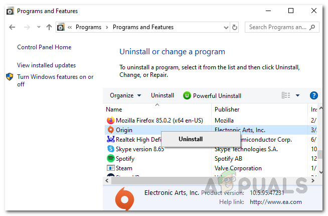 Control Panel - From the list of applications shown, double-click on Origin to uninstall the application. Alternatively, you can right-click on the application and choose Uninstall.