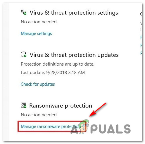 Opening the Windows Security tab - Inside the Windows Security screen, click on Virus and threat protection from the vertical menu on the left, then click on Manage ransomware protection (under Ransomware protection).