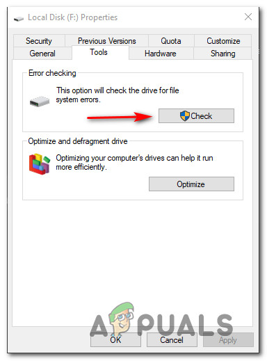 Several affected users have reported that the issue was resolved after they initiated an error checking attempt from the Tools screen of the affected drive. Here is some step by step instructions on how to do this: