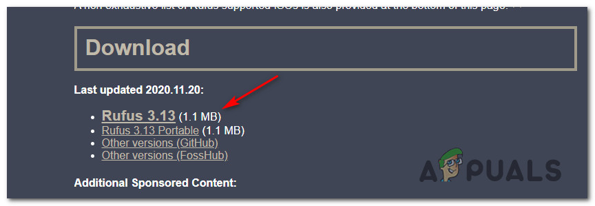 - After your computer boots back up, open your default browser and navigate to the official page of Rufus. Once inside, scroll down to the Download section and click on the latest standalone release of Rufus.