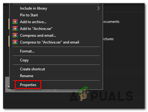 - Open File Explorer, right-click on the disk that is showing the ‘Error: Error while partitioning drive‘ error in Rufus, then choose Properties from the context menu.