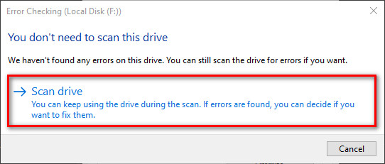 - At the next Error Checking screen, click on Scan drive and wait for the operation to complete.
