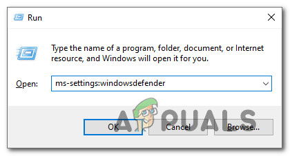 - Press Windows key + R to open up a Run dialog box. Next, type ‘ms-settings:windowsdefender‘ inside the text box and press Enter to open up the Windows Security tab of the Settings app in Windows 10.