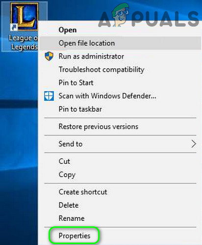 - Right-click on the problematic application/game shortcut (e.g., League of Legends shortcut) & choose Properties.