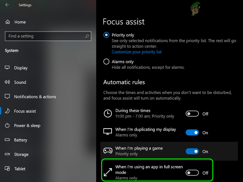 Disable When I Am Using an App in Full-Screen Mode - If not, then open the Focus Assist Settings (steps 1 to 2) and disable all the options under Automatic Rules.