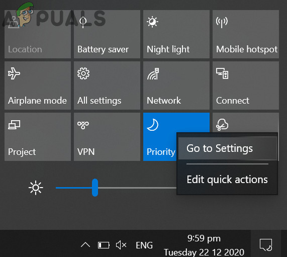 - Click on the Action Center icon (near the right of the system’s clock) and then right-click on the Focus Assist.