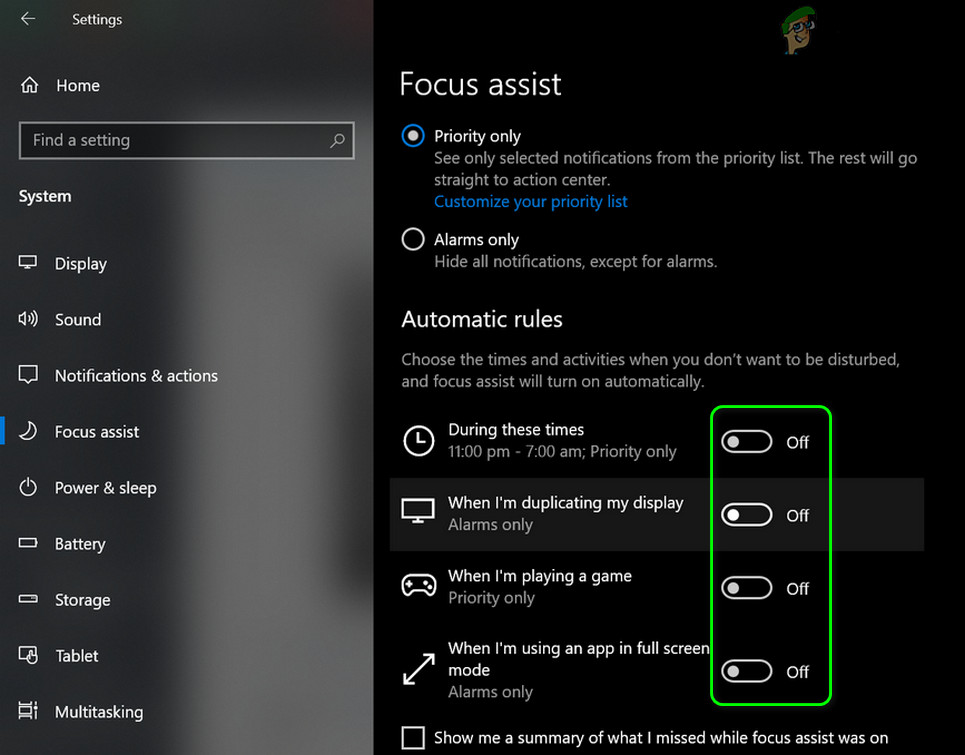 - If the issue reoccurs, then disable Focus Assist and check if the issue is resolved.