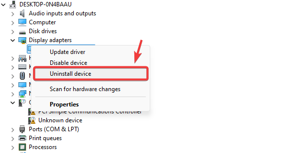 - Open Device Manager, expand Display Adapters, right-click the GPU driver, and select Uninstall device.
