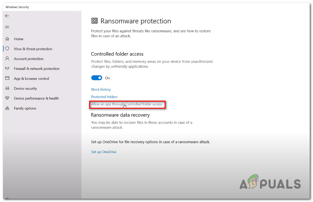 - Now Click on “Allow an app through Controlled folder access”
