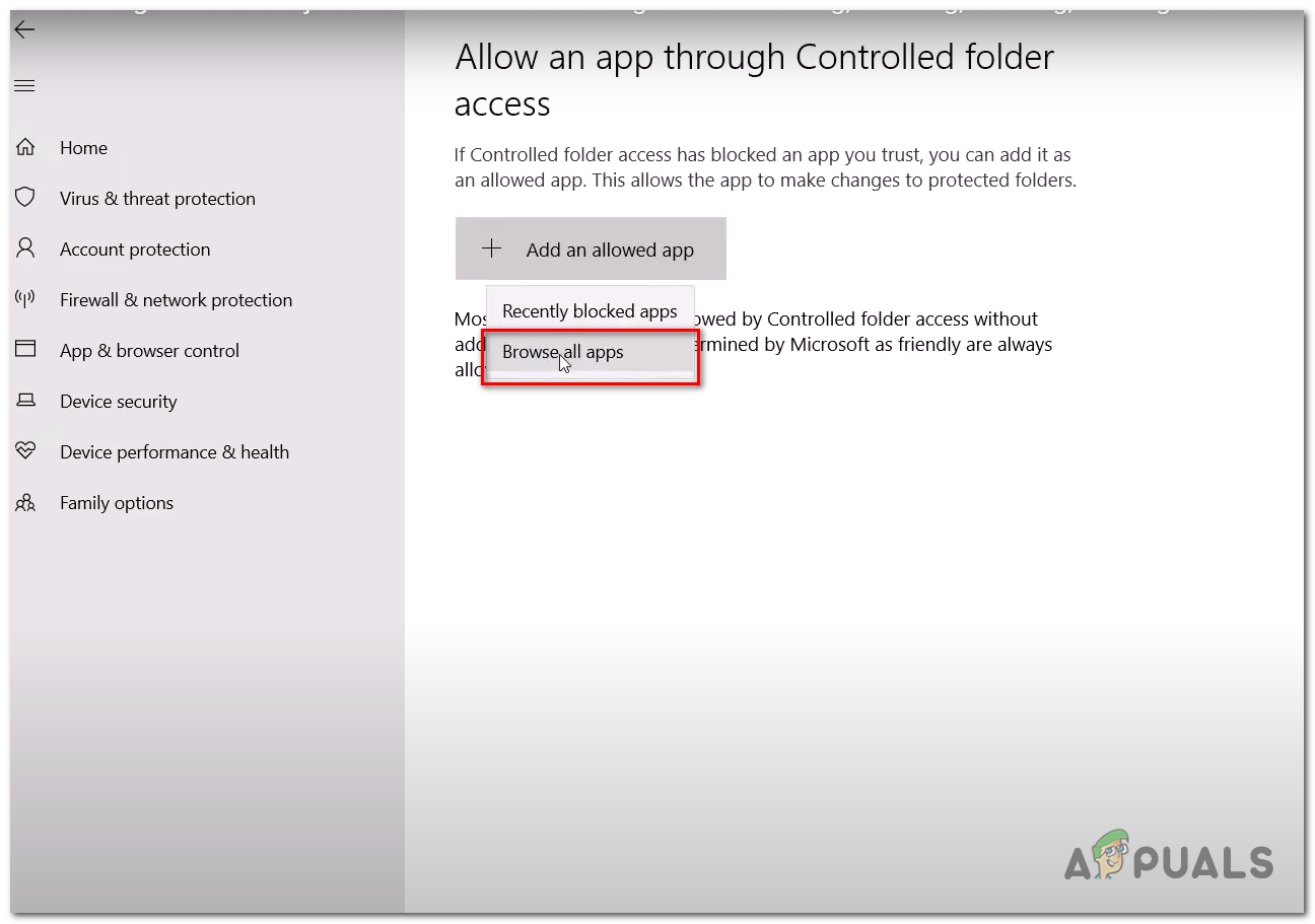 Allow an app through Controlled folder access - Click on add an Allowed app and click on browse all apps.