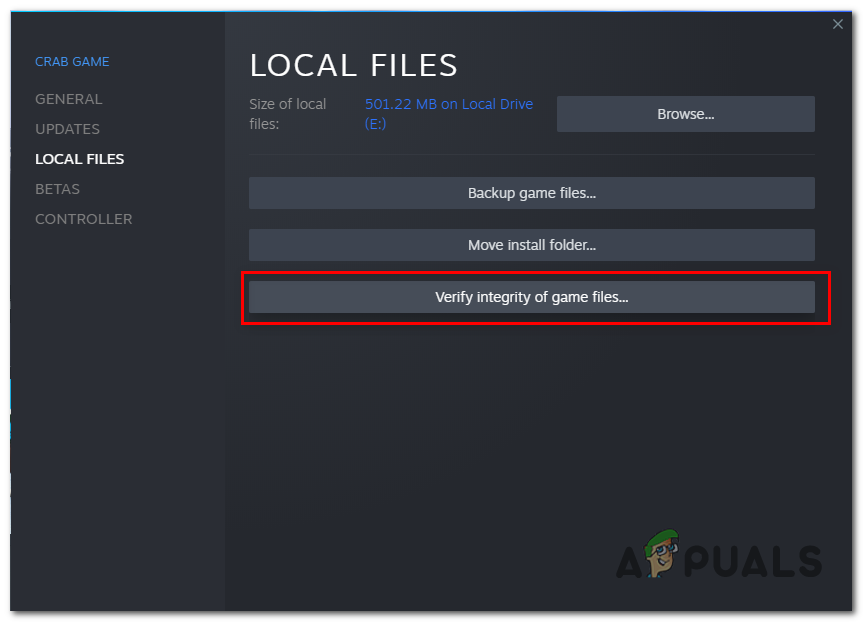 - Click on Verify Game Files Integrity and wait for a while until the files have been validated.